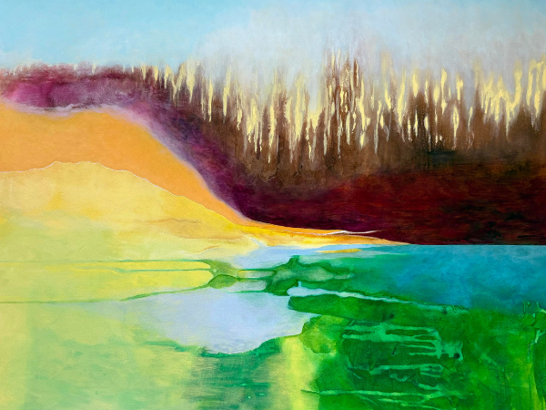 Open studio featuring this recently completed 4’ × 4’ painting. Influenced by the color and heat of tropical environments, the work focuses on atmosphere rather than place — inviting viewers into a warm, immersive mood.