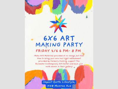 Join us for a 6×6 Art Making Party in support of Rochester Contemporary Art Center, and have your work exhibited this spring! We provide the supplies and deliver your submission for you, all you have to do is make art, and attend the gallery opening at RoCo if you like!
