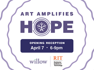 Join us for an exhibition of art by RIT students from the College of Art & Design to benefit Willow Center. Amplify Hope is the theme of the evening with dozens of pieces on display from a variety of mediums including paint, sculpture, and light. Willow Center serves over 8,000 survivors of domestic violence each year. The Amplify Hope campaign, launched in October 2022 as part of Domestic Violence Awareness Month, brings the hope of a brighter, safer future to survivors of domestic violence.