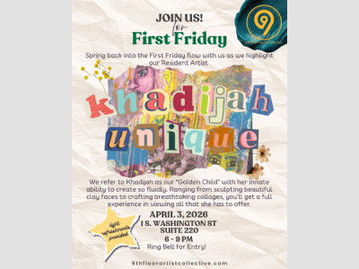 Join the 9th Floor Artists Collective for an evening of engaging discussion on art, culture, and creativity. This First Friday will focus on one of our resident artists: Khadijah Unique’s work and style. This gathering is an opportunity for artists, art lovers, and community members to explore the role of art in shaping our world, share insights, and build meaningful connections.