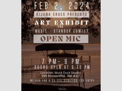 Kijana Crues presents an art exhibit and music / stand-up comedy open mic this month at Muck Duck!