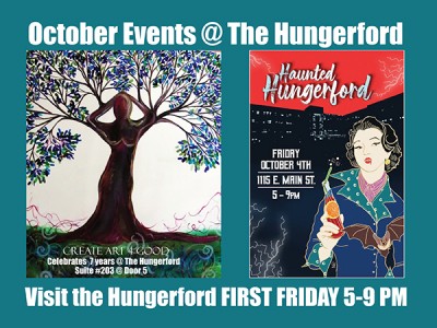 Susan Carmen-Duffy of Create Art 4 Good celebrates seven years at the Hungerford! Celebrating and honoring life with a practice of daily gratitude has become a way of life for Susan. Add in the opportunity to fully live and steep joyfully in her art, Susan brings her whimsical creations to this annual exhibit. Join her and celebrate seven years as an established gallery at the Hungerford building! Enter through Door #5. This exhibit continues through October. Other Hungerford galleries and studios are open for First Friday too, including special events like Haunted Hungerford! So much fun to be had! There is always free parking. Overflow available at Visions Credit Union across East Main Street as well as Greenovations. Do not park in front of Happy Feet.