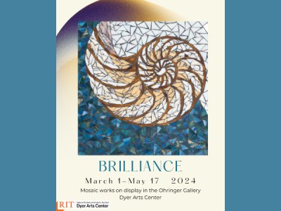ID: A beige background of a poster with a mosaic shell image in the center. It’s made with blue, white, brown, and pink mosaics. Above the mosaic is the title of the exhibit, Brilliance. Below the mosaic, text reads remembering the mosaic work of Melissa Skyer.
