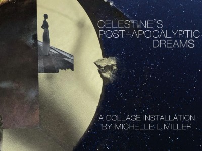 This exhibit reflects five years of exploration. It begins with the last human, Celestine, and her daring jump to another existence. The works are influenced by personal realities of social isolation, loneliness, life transitions, pandemics and a self-destructing world. It draws inspiration from sources as varied as Mary Shelley’s 1826 novel The Last Man, the art of Max Ernst, failed moon exploration, dream imagery, dieselpunk, transrealism, dark cyberpunk lo-fi, and the video game Fallout. It encompasses themes of creation, survival, dying, innovation, and rebirth through the lens of its main character, single female survivor Celestine.