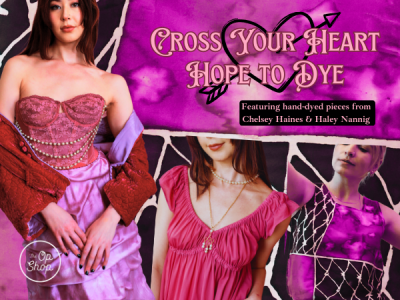 Cross Your Heart, Hope to Dye features hand-dyed and silk-painted garments by local artist and vintage reseller Chelsey Haines of Up In The Air Vintage and Portland-based artist Haley Nannig. In their mission to reclaim, revive, and resist buying new, Chelsey and Haley use traditional dyeing techniques on vintage clothing they’ve sourced. The title refers to both the act of making and the unpredictable nature of dyeing—cross your heart symbolizes the truth and intention behind the creative process, while hope to dye plays on the uncertainty of how pigments will take to fabric. Through natural dyeing and silk painting, this exhibition reflects the acceptance of chance and process that all creators experience, turning worn garments into a canvas of both challenges and triumphs.
