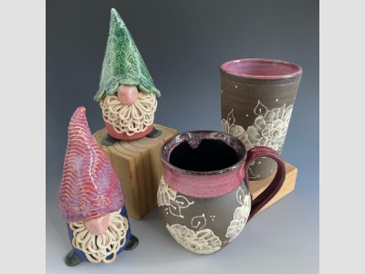 Start your unique holiday gift search at EAST MAIN CLAY. The gnomes suggest a beautiful mug or cup from Kate’s rose collection. There is a wide variety of ceramic pieces available for holiday gift giving.
