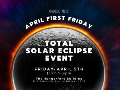 It’s April and we’re excited to celebrate the Eclipse. Come visit and see what the artists are up to. You might even find some eclipse merch. Painting, prints, photography, handmade jewelry, ceramic art, and hand painted silks can be found at The Hungerford. Open studios include Andrew Pokon 41, Wheel & Slab Danielle Pagani 106 (Door 5), Susan Elizabeth Portraits 216, Constance Mauro Studio 236, Black Cat Gallery 240, Cat Clay 242, Kerina Mangiaracino 252, Studio 254 Carol Domenico, Shannon Detinger 314, Kali Ann Studio 416 make your own eclipse block print, Jason Ferguson 423 featuring eclipse mugs, Harpole Art Studio 426 eclipse prints and a celebration cake, Hodaka Pottery 428, Phyllis Bryce Ely, Anne McCune, Patrice McPeak & Maureen Church 460, East Main Clay with Katydid Pottery & Tea Pottery featuring eclipse mugs & Gardanne Beads (Door 5B), and more. Empty Bowls pop up on 2nd floor, Studio 242. We’ll be open from 5-9 PM. Enter by Door 2.