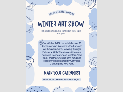 Over 15 Rochester and Western NY artists exhibiting and will be present at the event. Light refreshment provided by Carmen’s Cooking. This exhibition will continue through February 20, 2026.