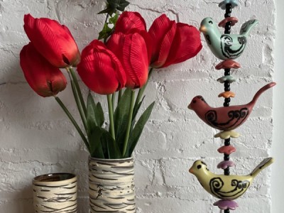 We are looking forward to spring… yes it is coming! EAST MAIN CLAY will be open from 5-9 with vases, birds, all of our colorful floral decorated mugs, bowls and platters. Can’t forget garden totem beads…