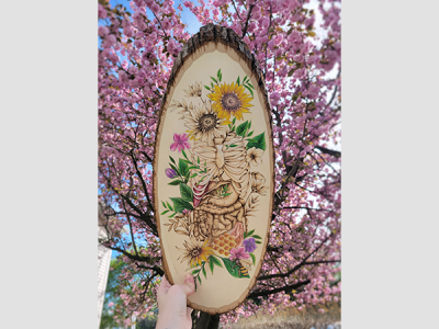 Specializing in pyrography (also known as woodburning), the pandemic has encouraged Megan to expand her artistic practice to incorporate colored pencil, watercolor, and expand her subject matter to include art pieces inspired by favorite folklore and local legends.