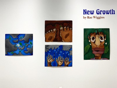 Rae Wiggins’ solo show New Growth features over a dozen of the artist’s recent works, several featuring their characters “the boi’s.” According to the artist, “The boi’s are included in this series since they’ve been with me from the very beginning and have grown just as much as I have. Through them I show multifaceted versions of myself and express how they and I have been sprouting, budding and blooming. The boi’s also allow for me to insert more of myself in my works.”