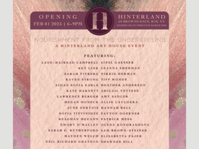 Nourishment from the Underground is an art exhibit comparing naturally-occurring mutual aid networks such as forest mycelium with the connections that human beings need and make to ensure their flourishing. Framed as a call for art, this show features 30 artists from all walks of life, both in and outside of Rochester, exploring what sustains them beneath the surface of their modern-day living. Artists were encouraged to share glimpses “behind the curtain” of their creative processes, inviting visitors to view finished works beside their rough drafts, field notes, and thumbnails, exploring the creative practice itself, and how it nourishes us.