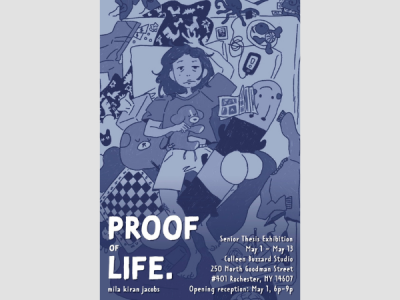 Illustrator, photographer, and printmaker Mila Kiran Jacobs presents her senior thesis exhibition. Proof of Life represents the culmination of her work throughout her undergraduate degree, exploring both the autobiographical and hypothetical objects, thoughts, and feelings that one leaves behind, in one way or another. This exhibition continues through May 13.