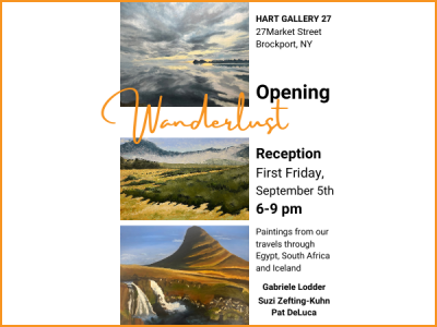 Visit us for the Opening Reception of Wanderlust. This exhibition will feature paintings by Gabriele Lodder, Suzi Zefting-Kuhn, and Pat DeLuca, showcasing their travels through Egypt, South Africa, and Iceland.