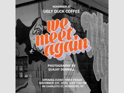 Known for his vibrant images of murals, artists in action and community, Quajay Donnell has been on a side quest over the last two years capturing Rochester in black and white instead. We Meet Again is a continuation of his B&W work, focused on his love of the art in the streets, highlighting work that is both sanctioned and unsanctioned, and appreciating what it adds to the creative fabric of our city.
