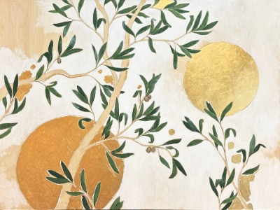 Historically, an olive branch carried by a dove in flight represents a global symbol of peace, forgiveness and unity. Recent work by American artist Kate Tortland offers a flourish of olive branches in golden light, waiting for “Where Doves Fly”.