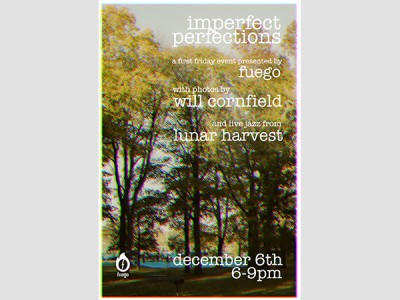 Join us for the opening of Imperfect Perfections, an exhibition of work from local photographer Will Cornfield, featuring shots created with expired and torn film, visual anomalies and more. Also check out live jazz by Lunar Harvest between 7 and 8 pm. Photos will remain on view throughout the month.