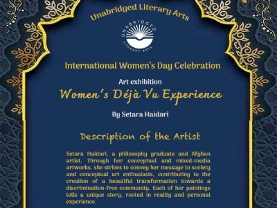 To celebrate International Women’s Day, Akimbo Books and Unabridged Literary Arts are featuring a solo exhibition by Setara Haidari. Setara’s work is conceptual and mixed-media that strives to convey her message of a discrimination-free community. Each of her paintings tells a unique story rooted in reality and personal experience.